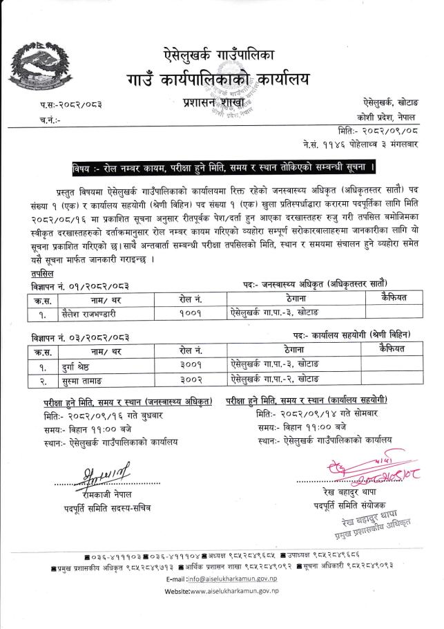 रोल नं. कायम, परीक्षा हुने मिति, समय र स्थान तोकिएको सम्बन्धी सूचना ।