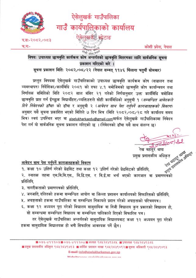 उपाध्यक्ष छात्रवृत्ति कोष अन्तर्गत छात्रवृत्ति वितरणका लागि सार्वजनिक सूचना प्रकाशन गरिएको बारे ।