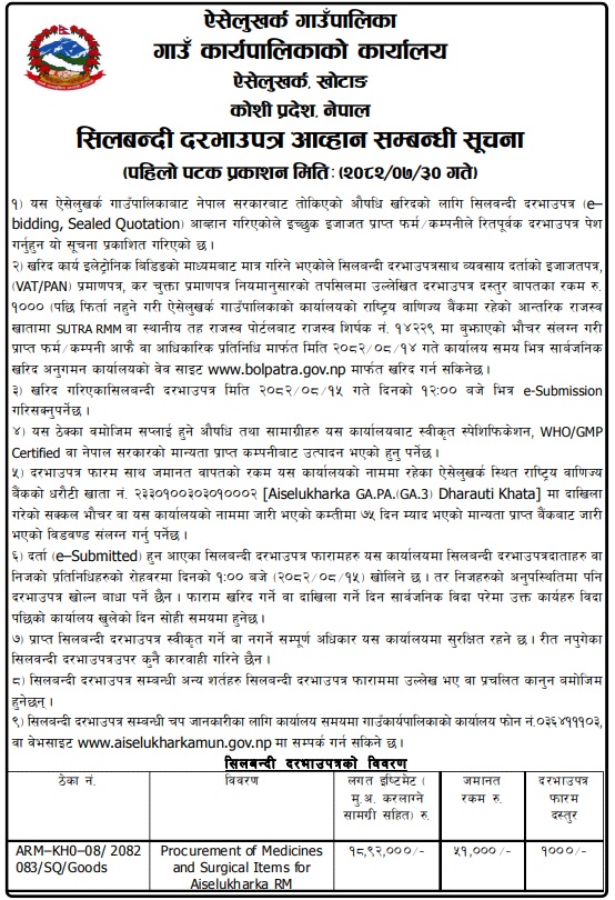 औषधि खरिद सम्बन्धी शिलबन्दी दरभाउपत्र आव्हानको सूचना ।