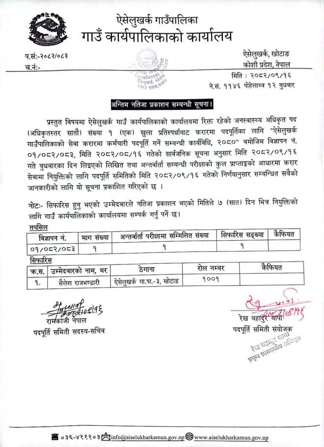 जनस्वास्थ्य निरीक्षक पदको अन्तिम नतिजा सम्बन्धी सूचना ।