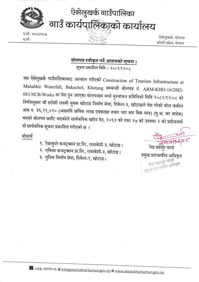 बोलपत्र स्वीकृत गर्ने आशयको सूचना ।
