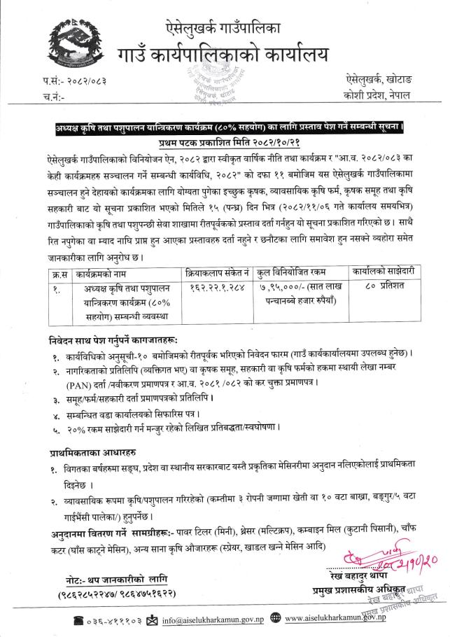 अध्यक्ष कृषि तथा पशुपालन यान्त्रिकरण कार्यक्रम (८०%सहयोग) का लागि प्रास्ताव पेश गर्ने सम्बन्धी सूचना ।