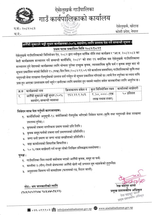 अलैंची सुकाउने भट्टी सुधार कार्यक्रमका (५०% सहयोग) लागि प्रस्ताव पेश गर्ने सम्बन्धी सूचना ।