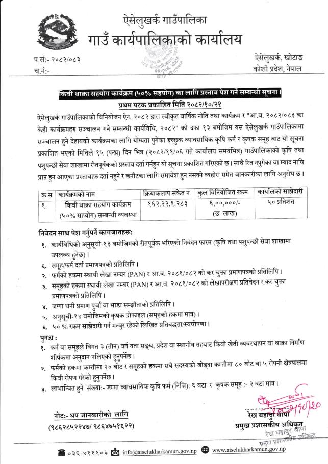किवी थाक्रा सहयोग कार्यक्रम (५०% सहयोग) का लागि प्रस्ताव पेश गर्ने सम्बन्धी सूचना ।