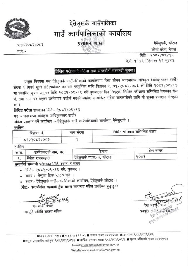 जनस्वास्थ्य निरीक्षक पदको लिखित परीक्षाको नतिजा तथा अन्तर्वार्ता सम्बन्धी सूचना ।