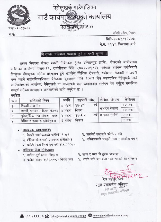 निशुल्क तालिममा सहभागी हुने सम्बन्धी सूचना ।
