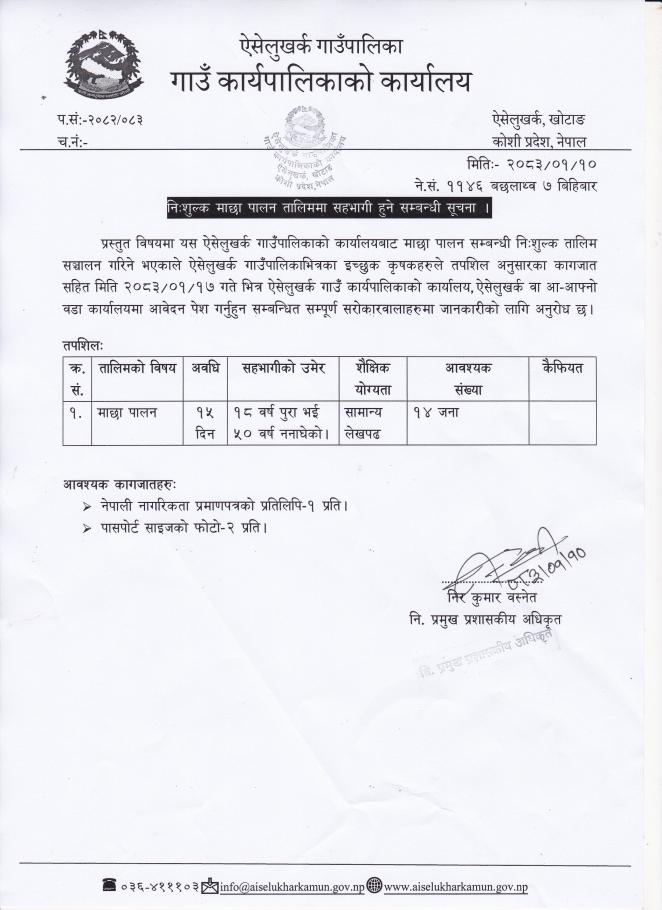 नि-शुल्क माछा पालन तालिममा सहभागी हुने सम्बन्धी सूचना ।
