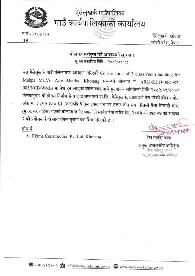 बोलपत्र स्वीकृत गर्ने आशयको सूचना ।
